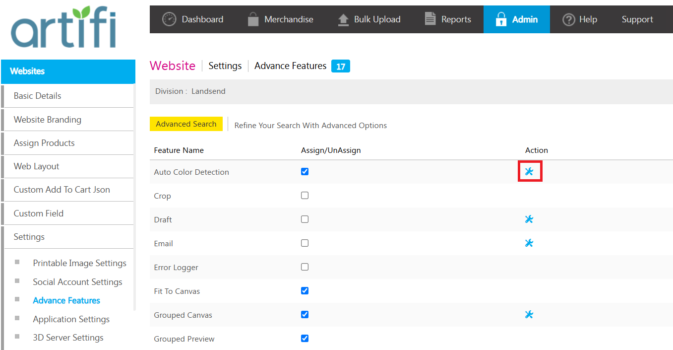 To alter the default settings of Auto Color Detection, go to the Settings in Action column.