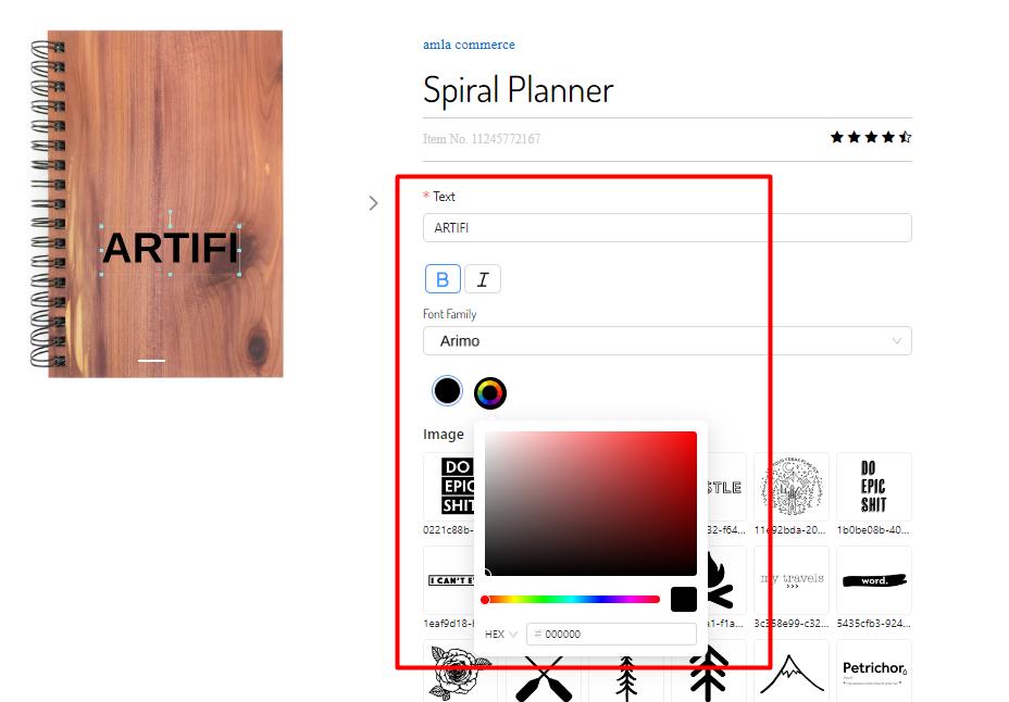 | Text open widget list component | Allows inclusion of text boxes and formatting properties as configured in Artifi admin. | Text Properties: Text box captions, font family, font size, text color, character limit, text validation, number of text lines, bold, italic, horizontal alignment. |