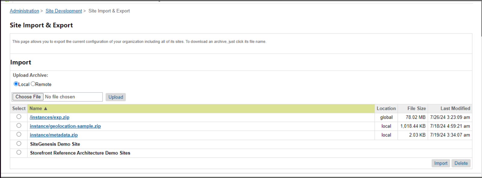 - Go to Business Manager > Administration > Site Development > Site Import & Export.