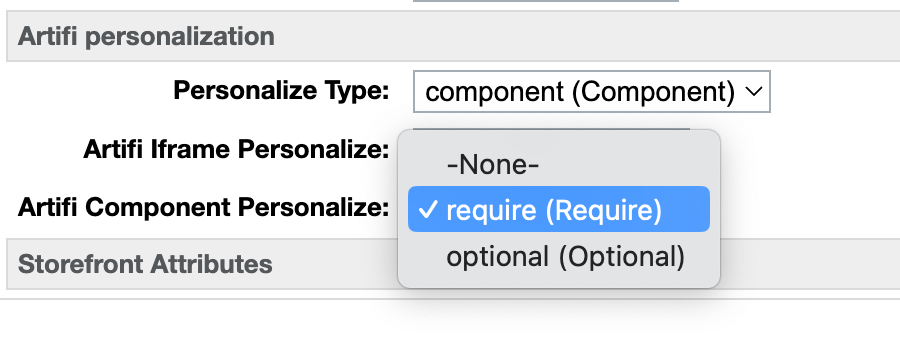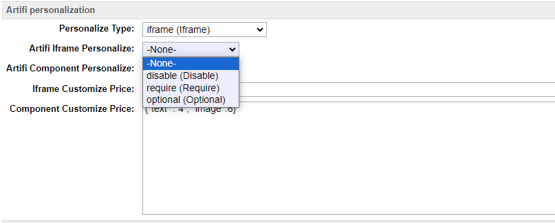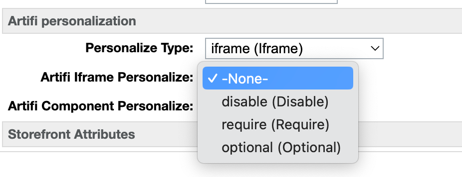| Artifi Iframe Personalize (c_iframe_personalize) | Enum | Decides the personalization requirement for the Iframe approach. | Require: Product must be personalized before adding to cart. Optional: Personalization is optional; user can personalize or add to cart directly. Disable: Personalization is disabled; button is not visible on PDP. |