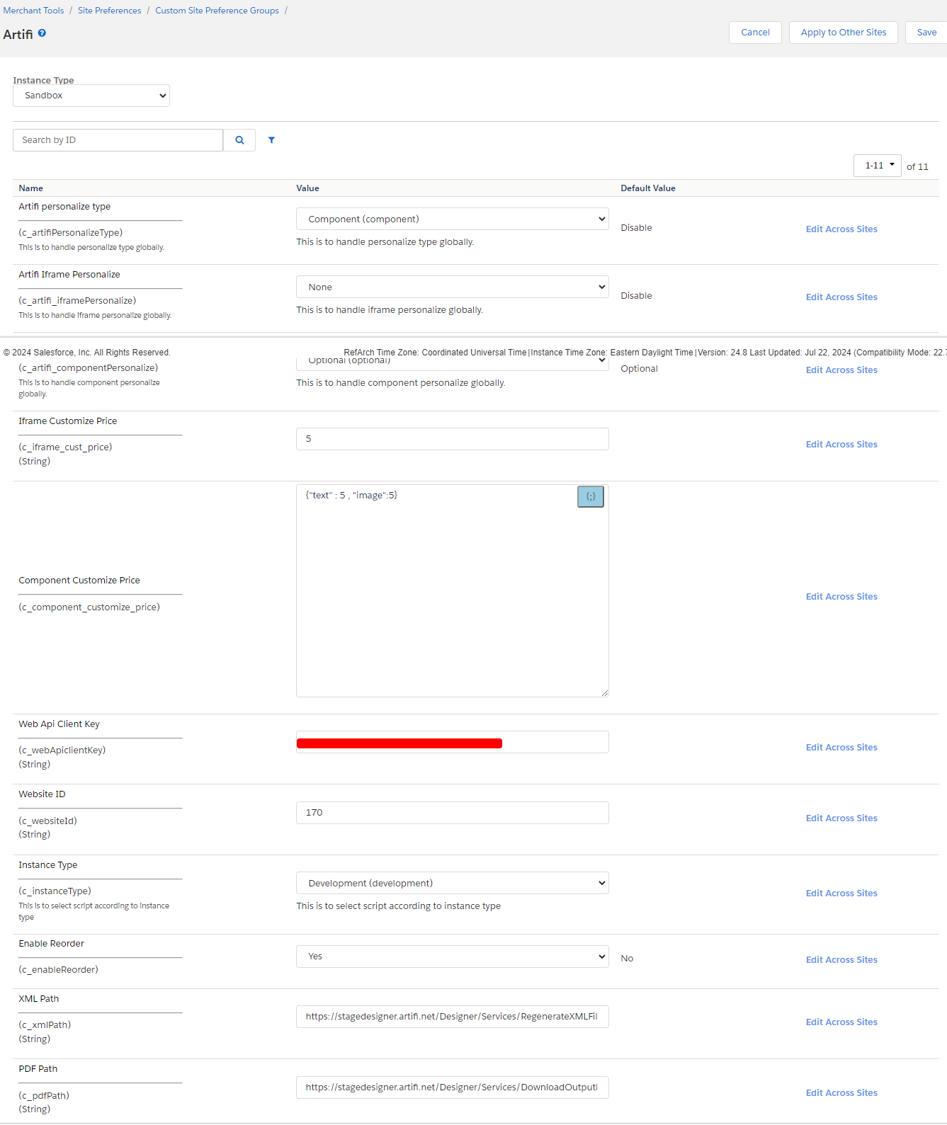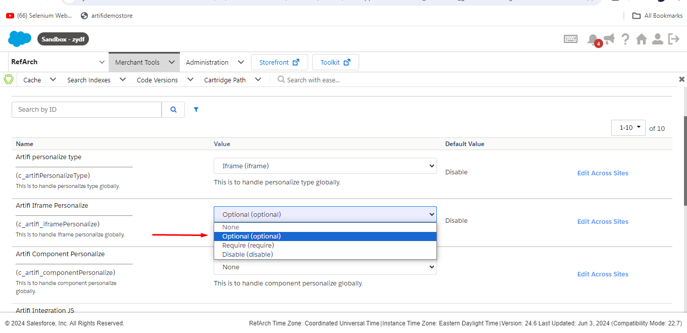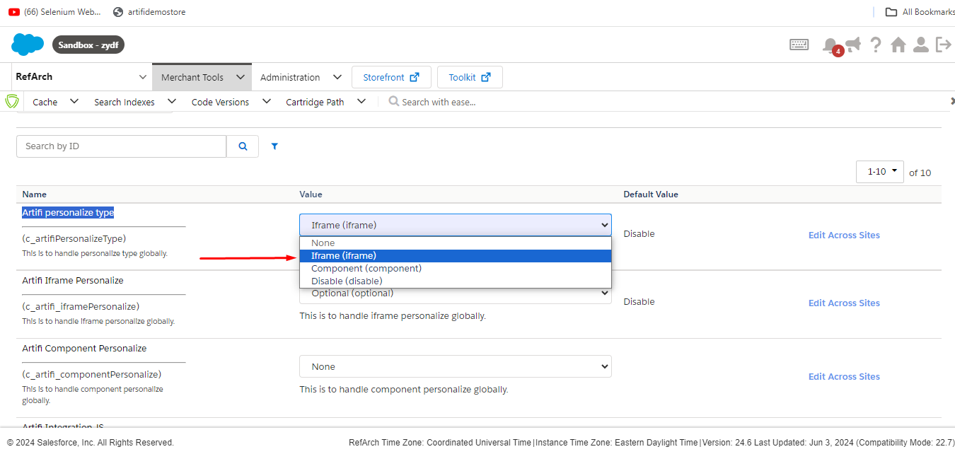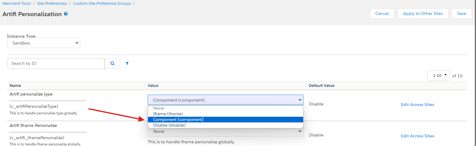 - Go to Merchant Tools > Site Preferences > Custom Preferences > ArtifiPersonalization.