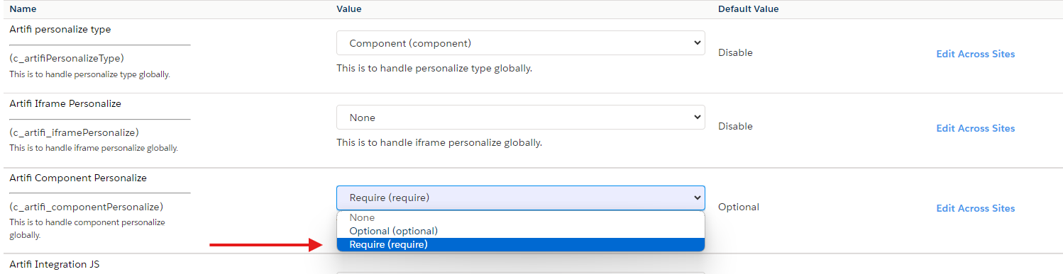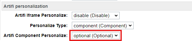 | Personalize Type (c_personalizeType) | Enum | Decides between Iframe or Component-based personalization approach. | iframe-Based: Personalization via Artifi-rendered Iframe. Component-Based: Personalization via Artifi components on the same page. None: Personalization is disabled. |