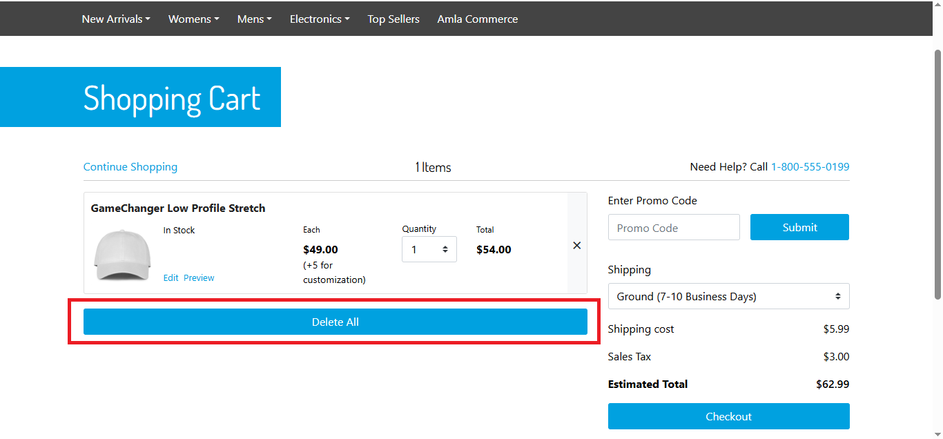 Purpose: This code adds custom cart styling and personalization JavaScript, displays a “Delete All” option with a confirmation modal.